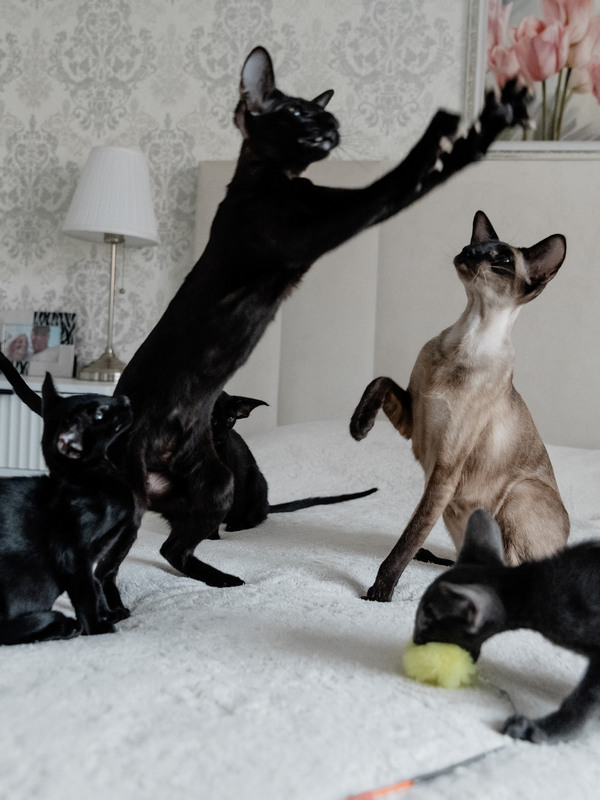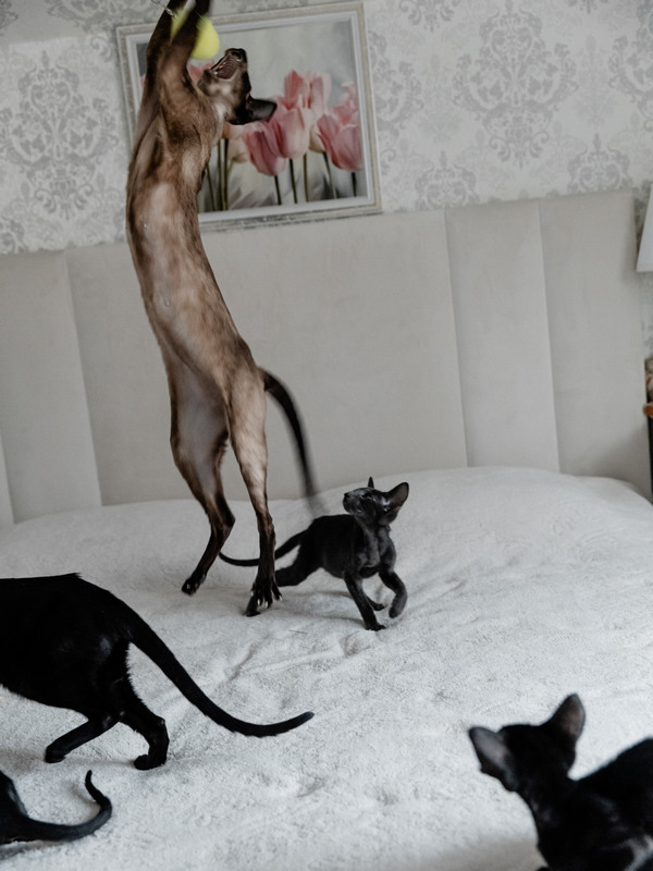 Ориентальная кошка – это вечный двигатель. Даже взрослый кот ориентал сохраняет активность, любопытство и желание играть. Они любят интерактивные игрушки, догонялки, лазалки и любые занятия, где можно не только побегать, но и «подумать».