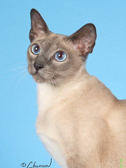 А что касается формы, то здесь есть отличия, хоть и не такие явные. Глаза сиамов миндалевидной формы, слегка раскосые. Расстояние между глазами должно быть не менее ширины глаза. У тайцев глаза большие, верхнее веко миндалевидное, нижнее слегка округлое. Они слегка раскосые.